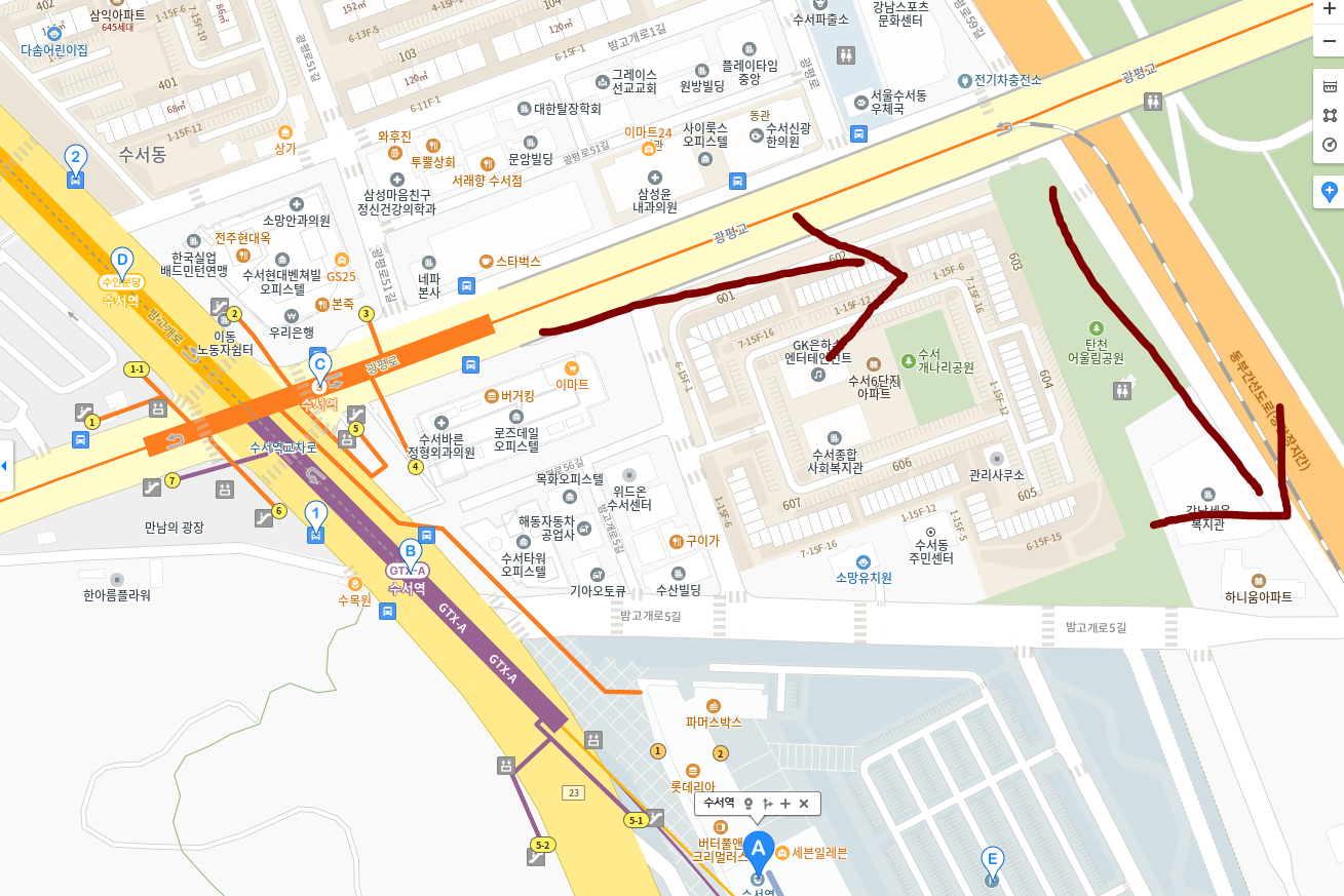 수서역에서 4,5번 출구로 나와서 탄천 쪽으로 걸어가시면 돼요~
